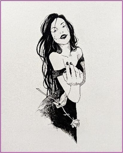 Insubordinate (Amplify Publishing, 2023) is available in hardcover, paperback, and e-book. The beautiful pen-and-ink illustrations of the archetypes are by Inbar Fried. Here’s her rendition of the Temptress: