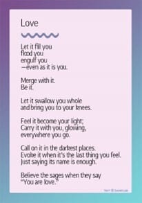 Jocelyn: The last line of the Love card is “Believe the sages when they say: You are love." I love that line! What do you think prevents people from believing it? What happens when we come to believe it?